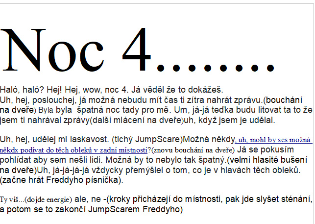 Fnaf 4 nemá moc velkej příběh. Ale odehrává se to když byl Michael Afton omráčen jeho otcem Williamem.
